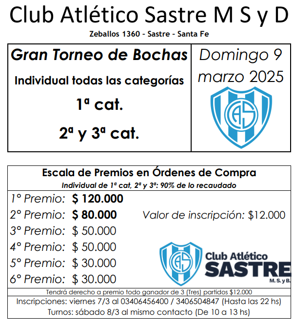 Los bochófilos del Club Atlético Sastre tendrán actividad oficial en casa cuando el próximo domingo 9 de marzo se lleve a cabo el primer “Gran Torneo de bochas” Individual todas las categorías.